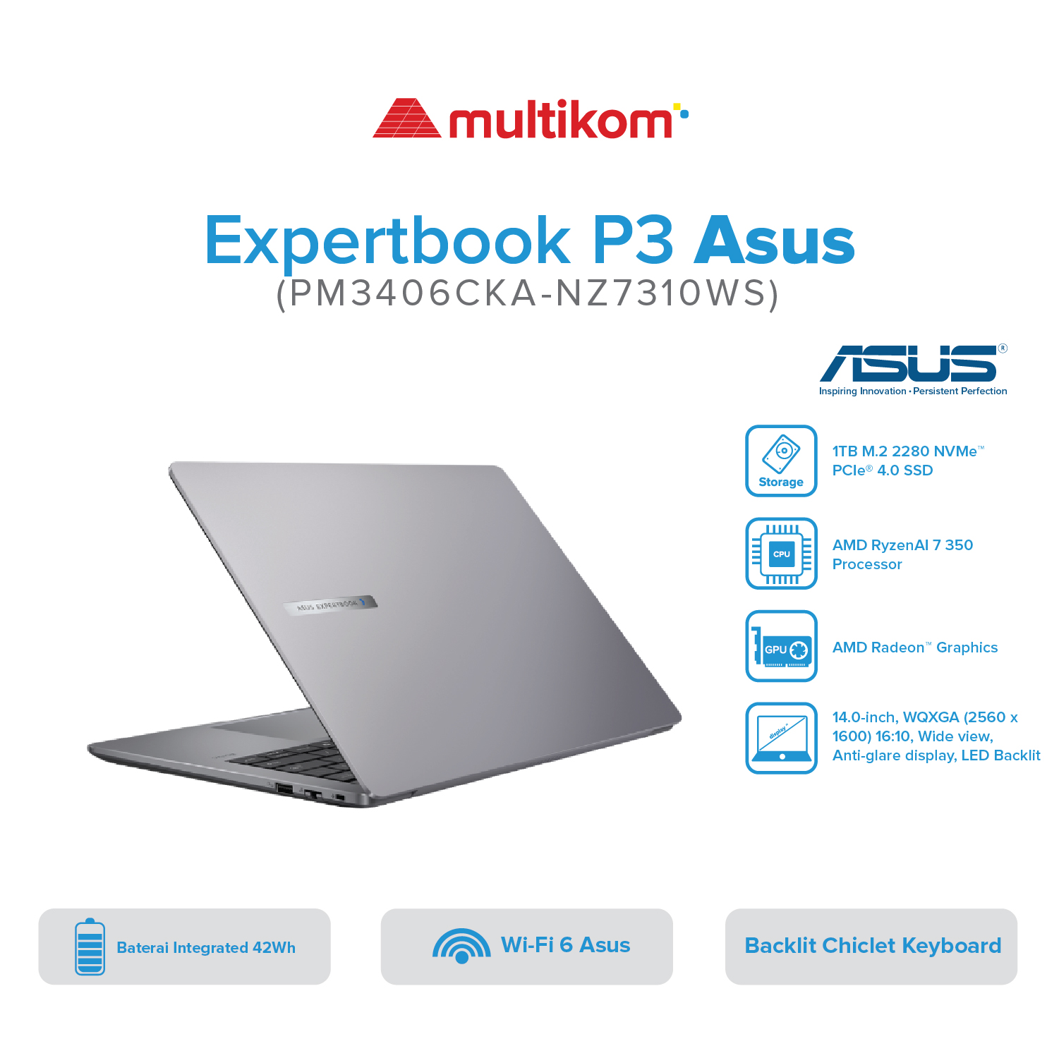 - Prosesor: AMD Ryzen 7 350 (hingga 5.0 GHz, 8 core, 16 thread) dengan NPU 50 TOPS untuk AI.